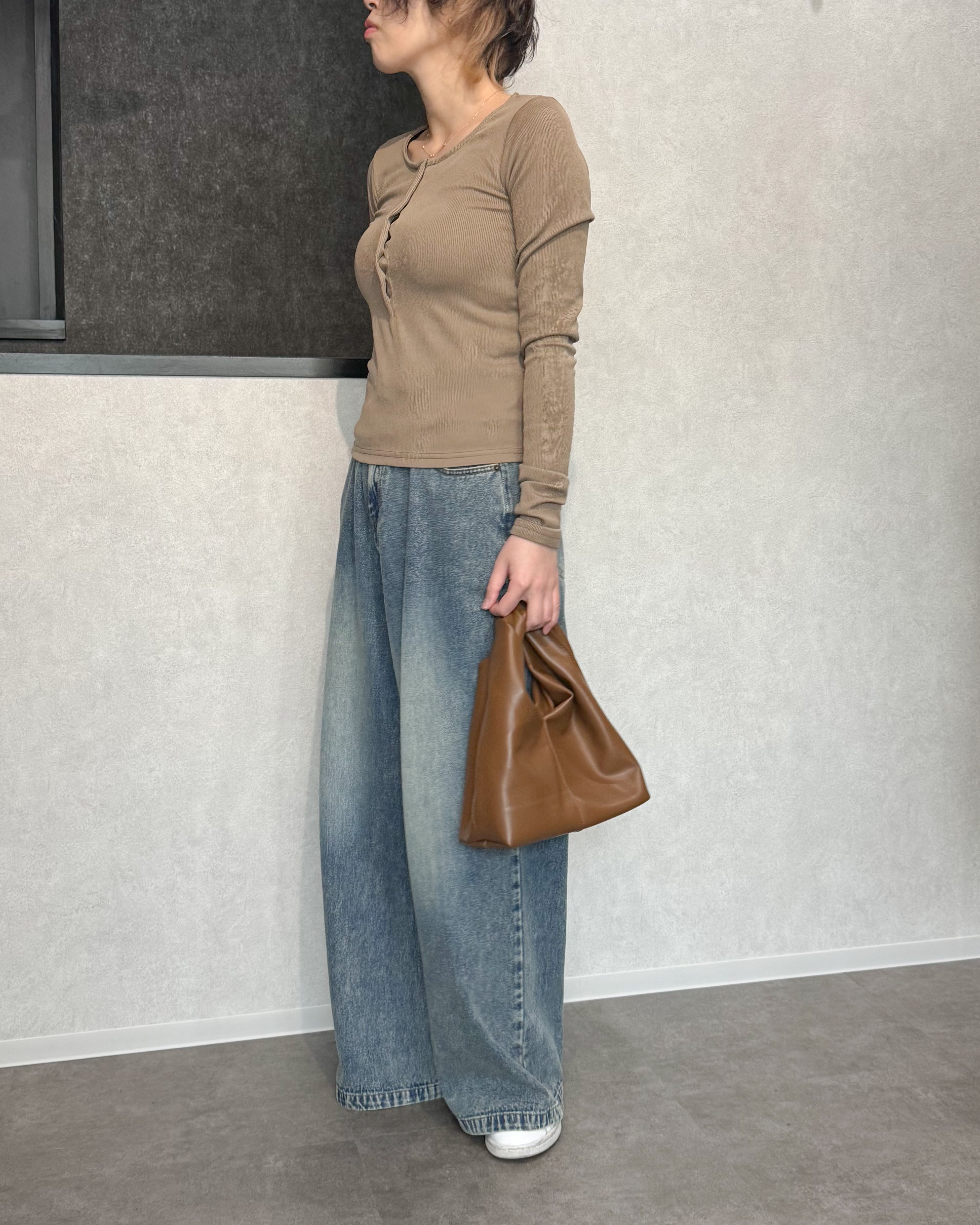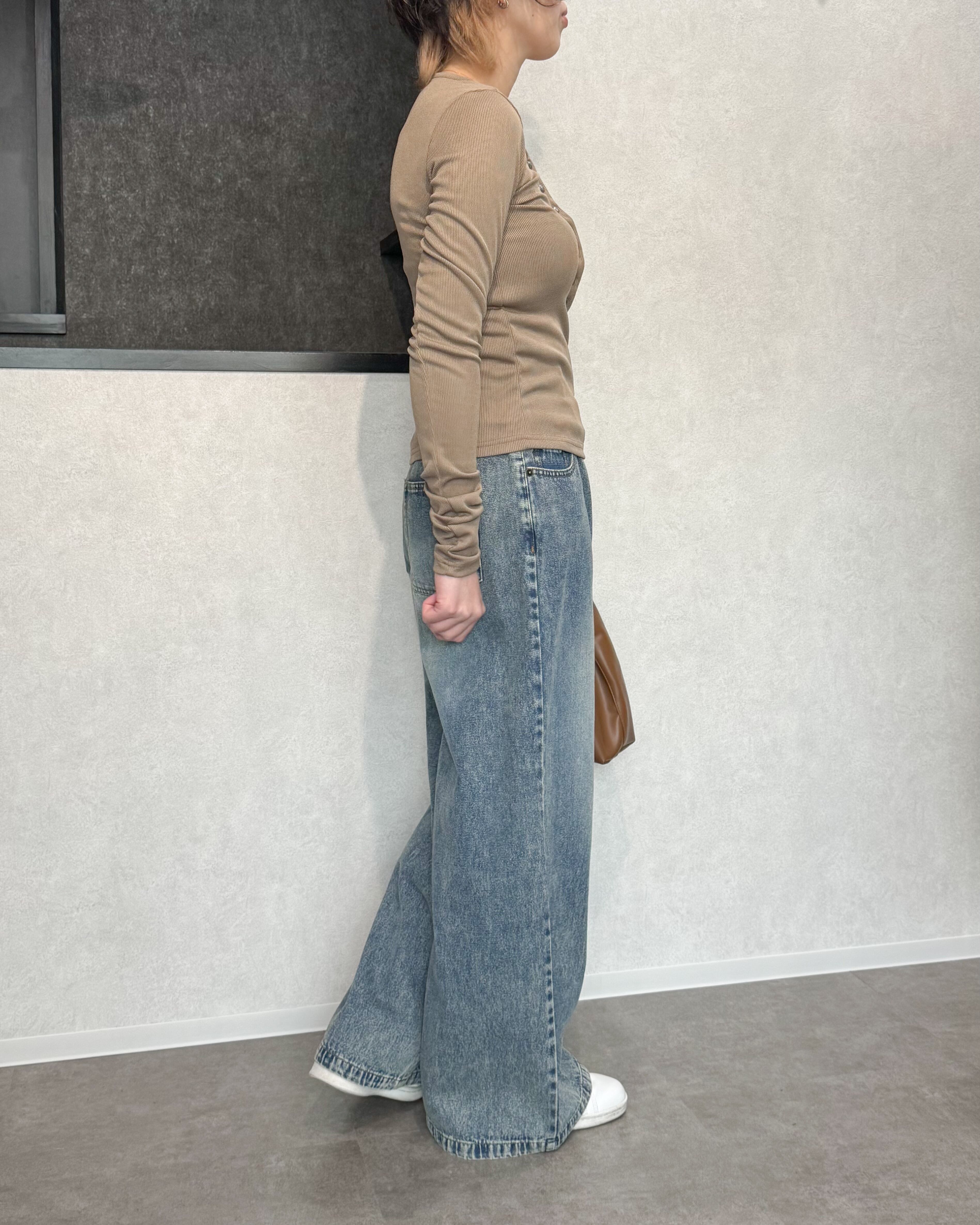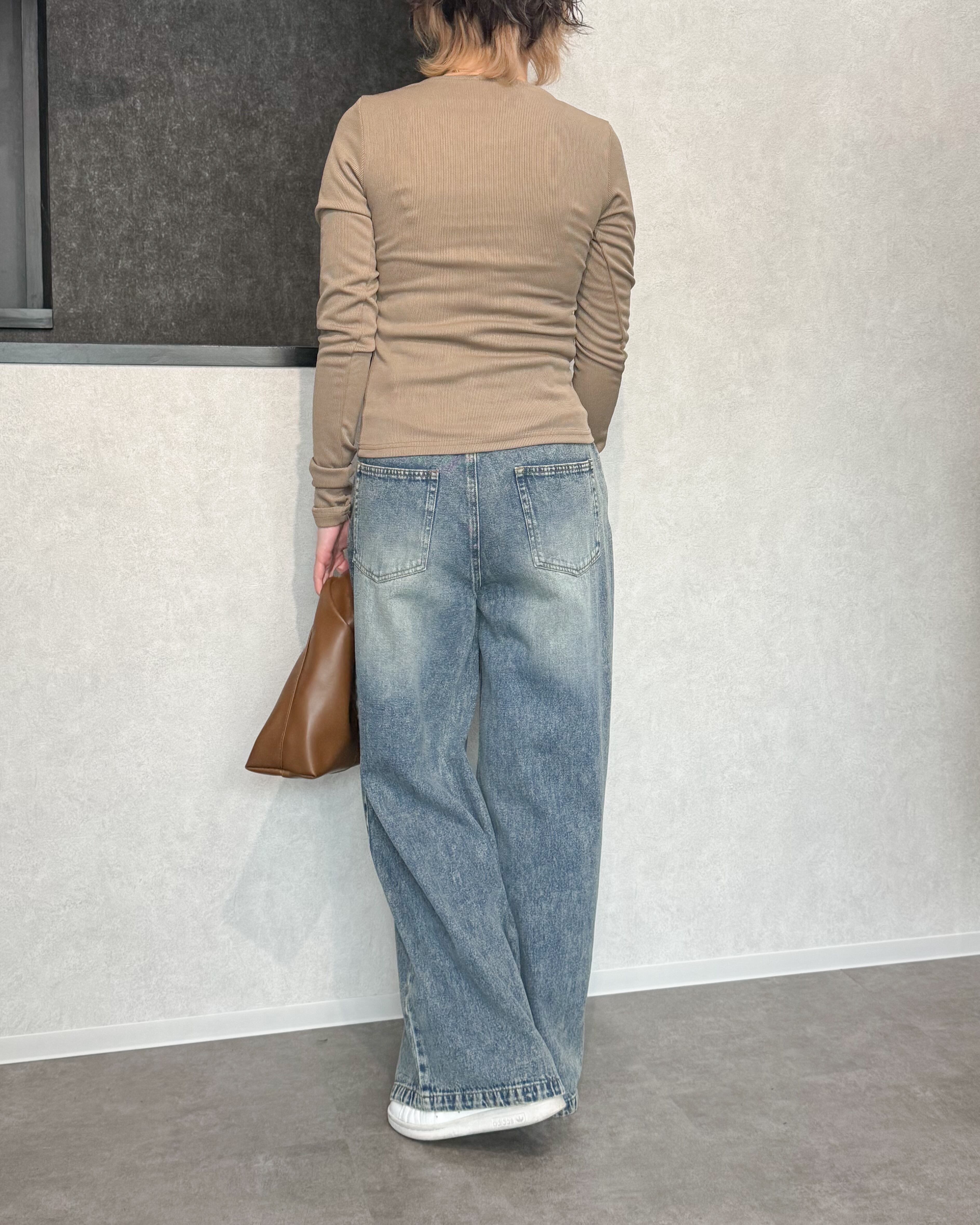 カットソー素材も、細めのリブで上品な印象に。
