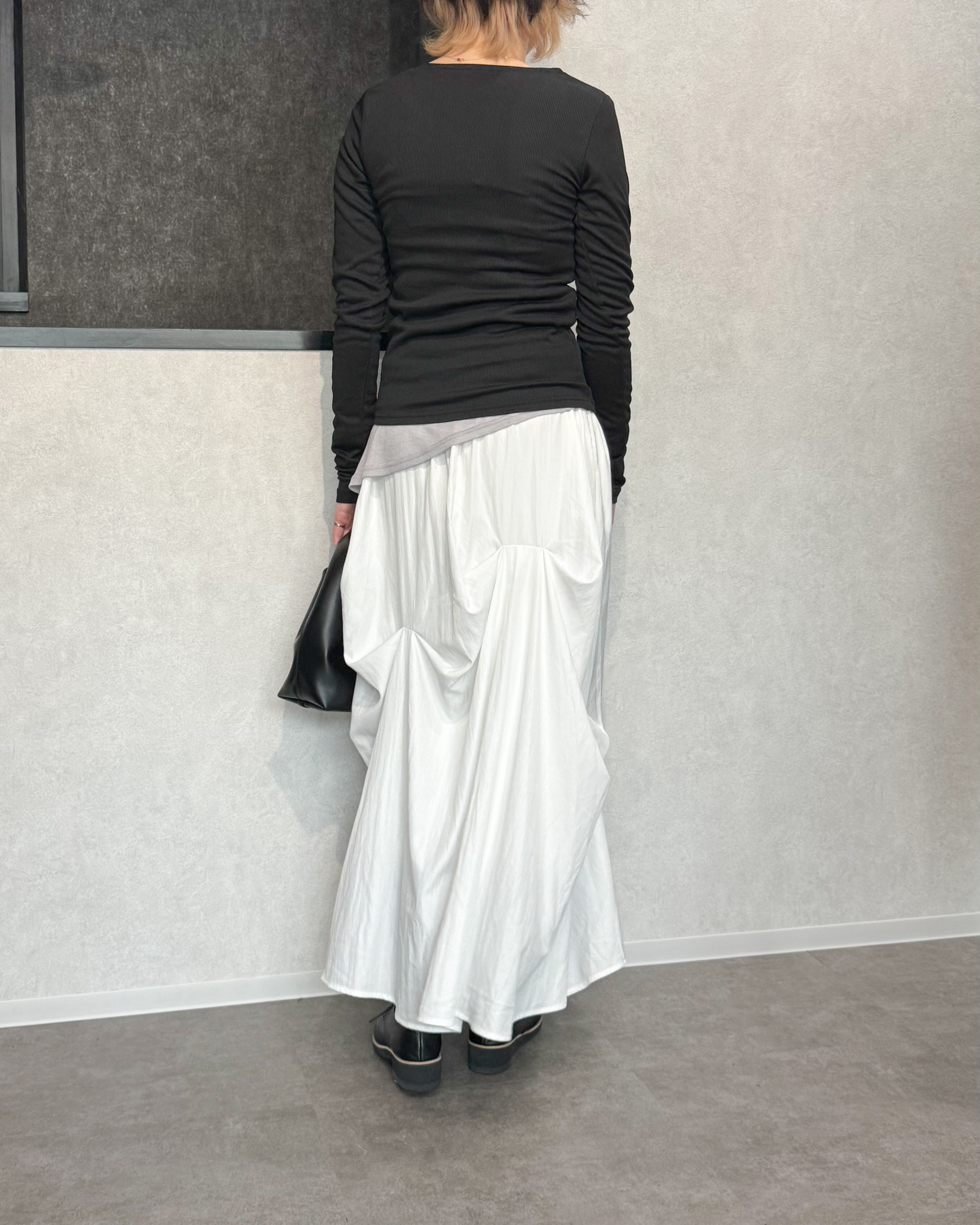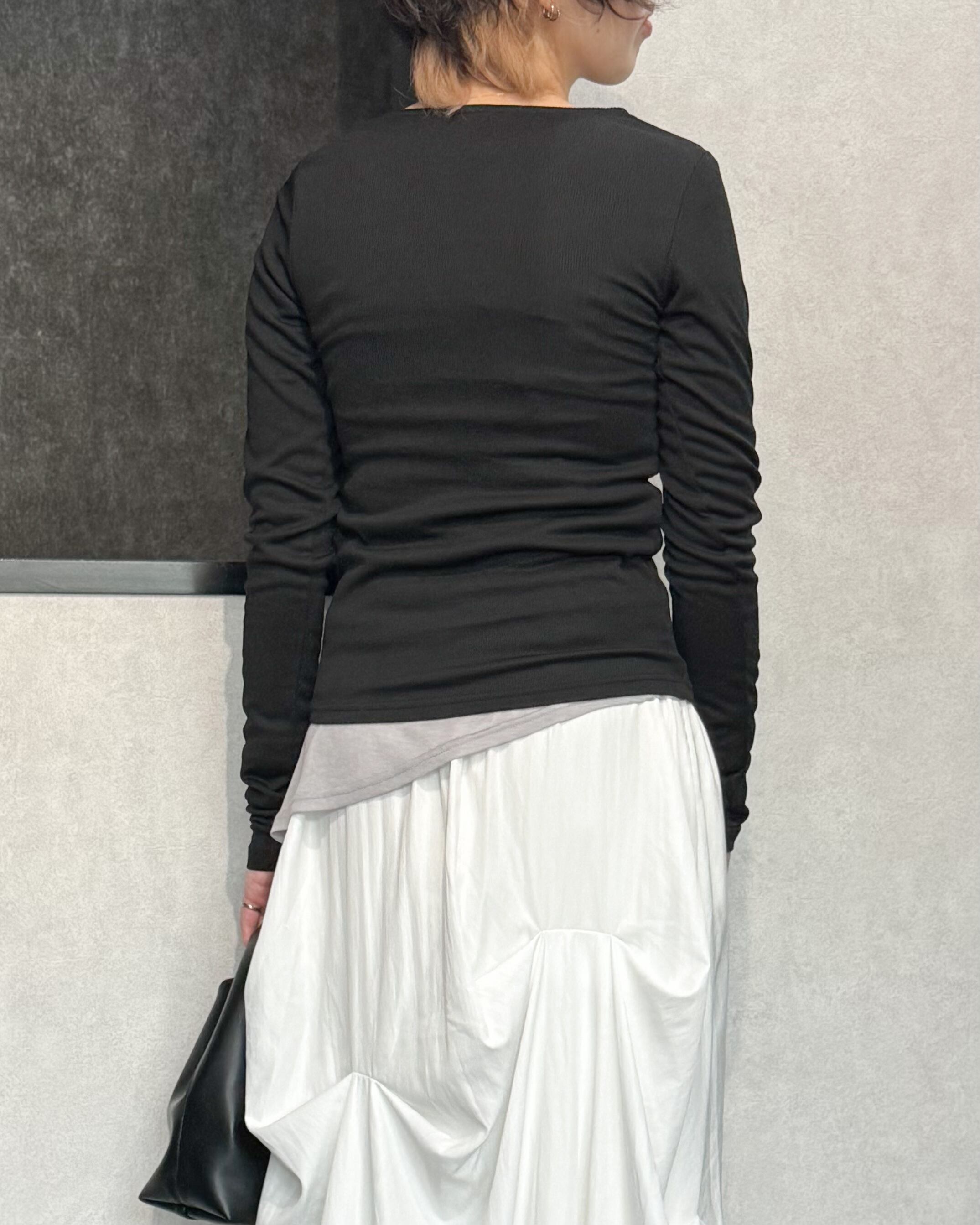 カットソー素材も、細めのリブで上品な印象に。